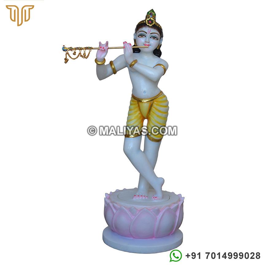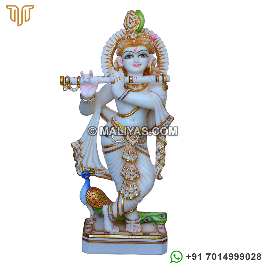 Golden work Krishna Statue from White makrana Marble. Made using high quality marble, this statue tuewhen finished and polished reflects an unparalleled shine.