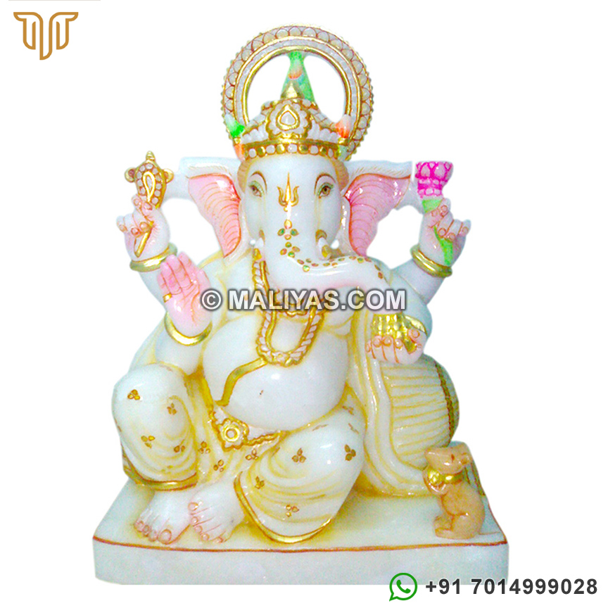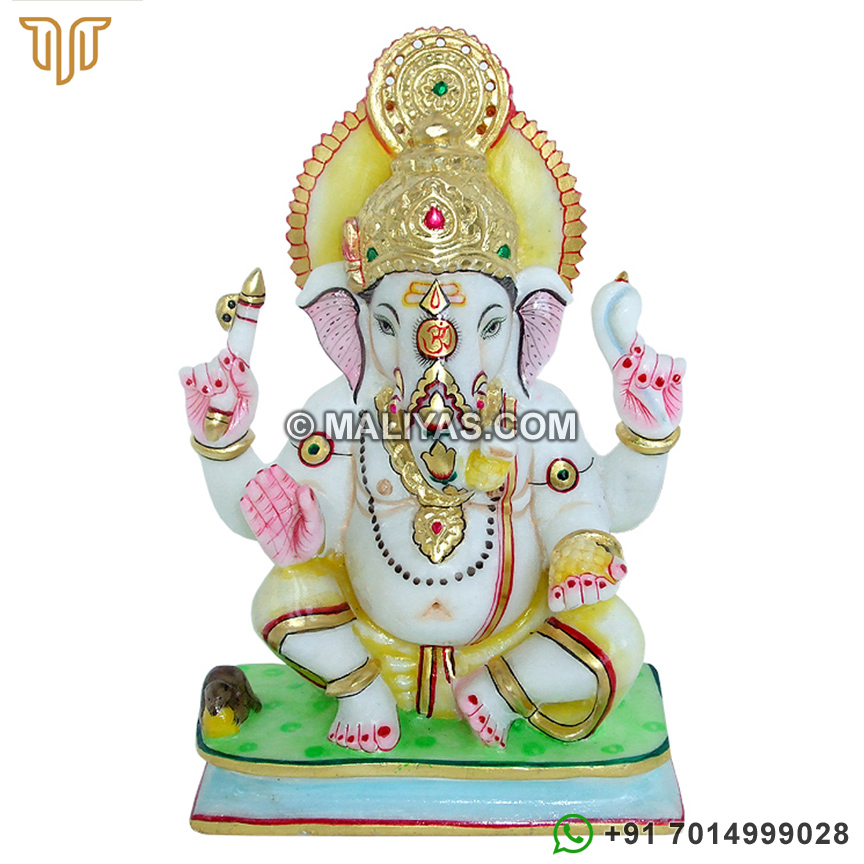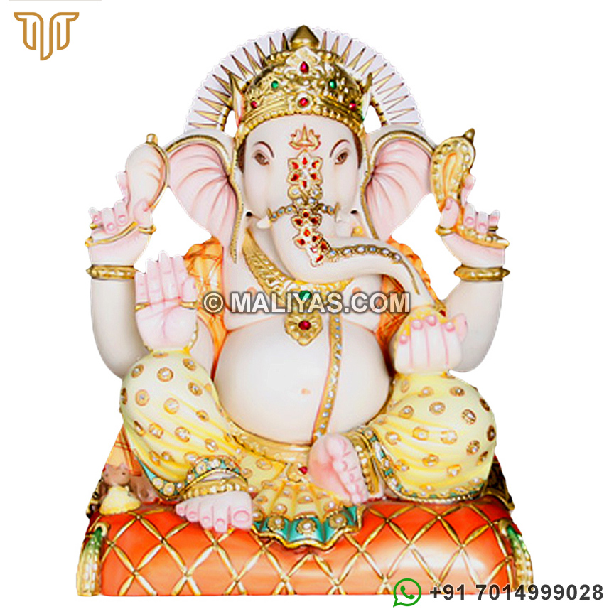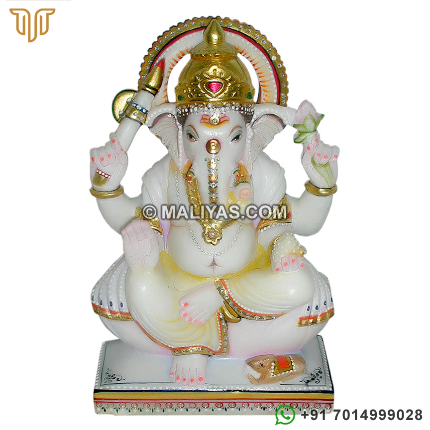 We manufacturer white Ganesh statue where ganesh ji is sitting with all his weapons in his hands. Sculpted from high quality white marble with unmatched workmanship.