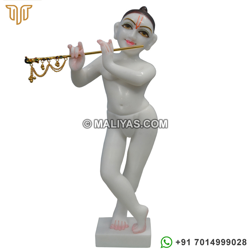 Lord Isckon Krishna Spotless White Marble Moorti. Made using high quality marble, this statue tuewhen finished and polished reflects an unparalleled shine.