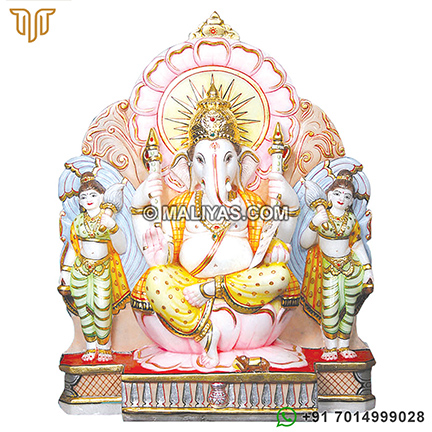 The marble Ganesh sitting with Riddhi Siddhi is designed to perfection and provides a stunning view. The statue is a symbol of fortune, happiness, peace and prosperity in many Indian homes.
