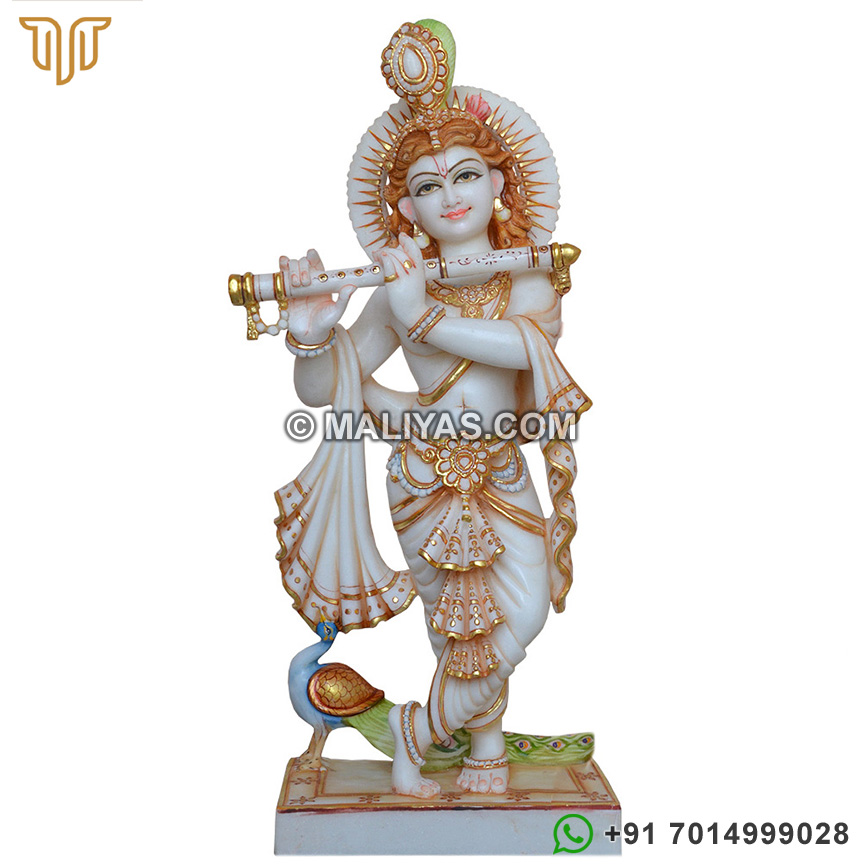 Exquisite Krishna with peacock Statue in Marble. Made using high quality marble, this statue tuewhen finished and polished reflects an unparalleled shine.