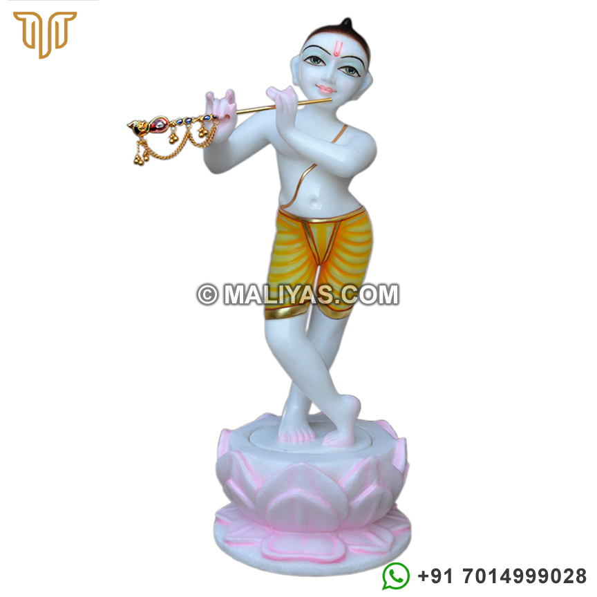 Marble Iskcon Krishna statue on louts flower. Made using high quality marble, this statue tuewhen finished and polished reflects an unparalleled shine.