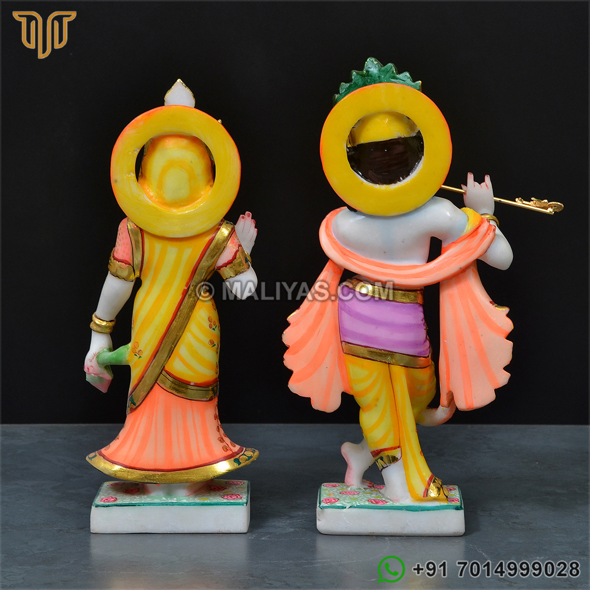 This exquisite statue features Muilticolour Marble Radha Krishna Statue intricately handcrafted from first grade marble with a special golden foil painting work. The statue showcases a captivating presence with its majestic multiple sizes, it exudes durability and sturdiness.