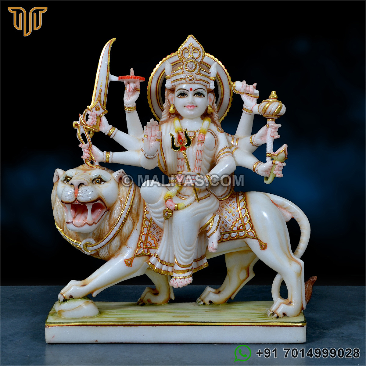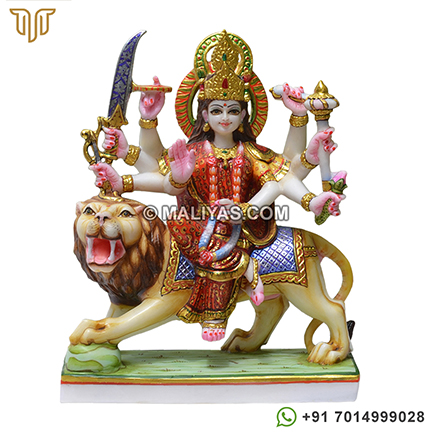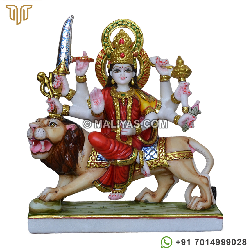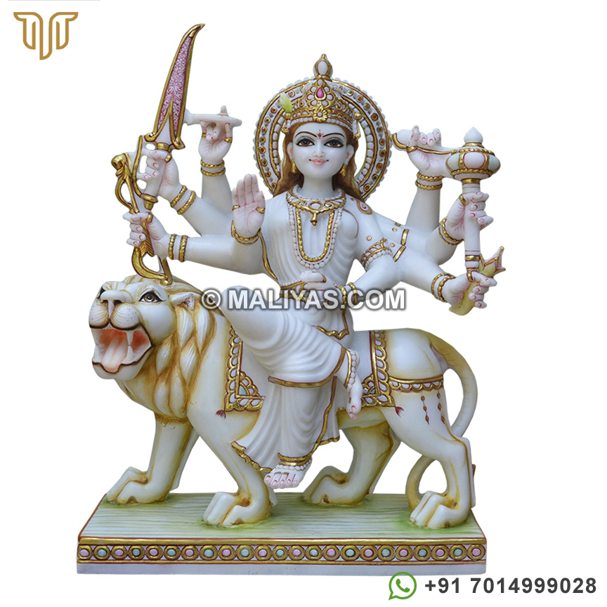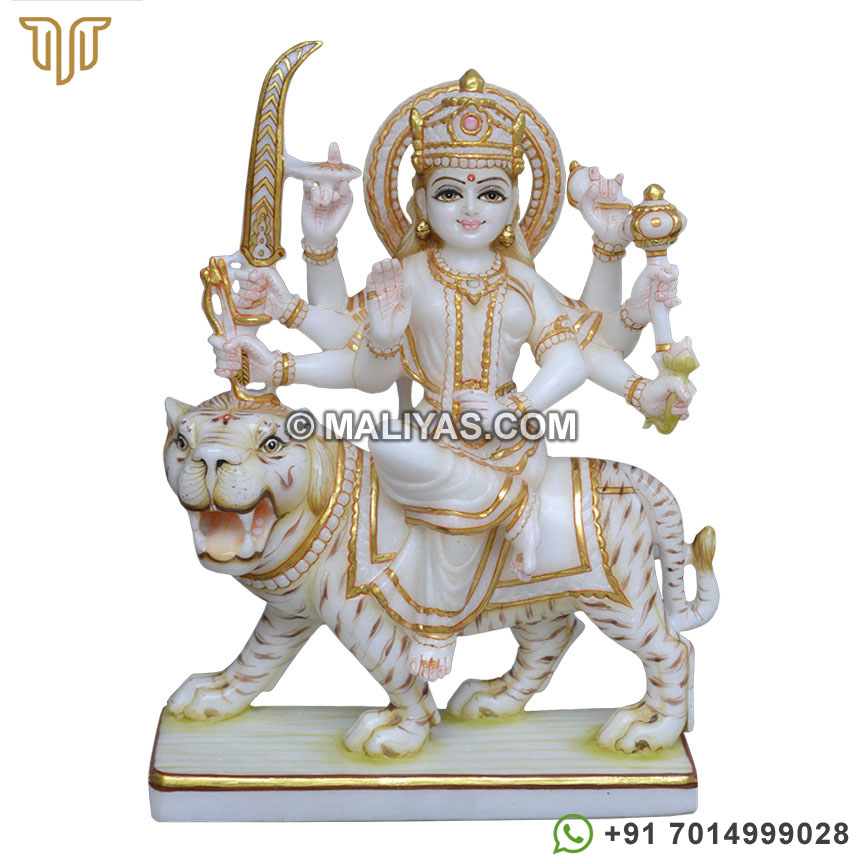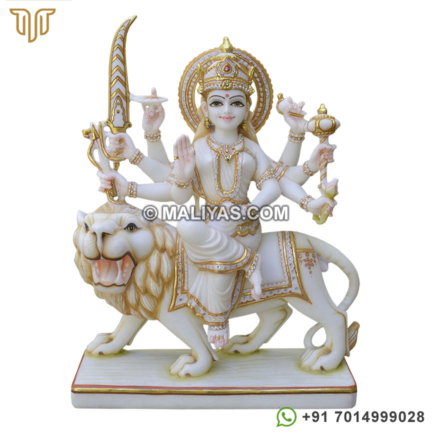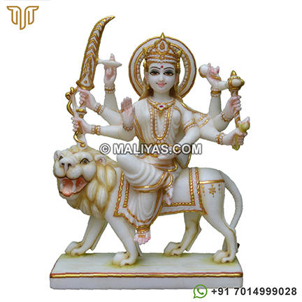Buy maa durga marble statue online made by a senior artist in Makrana marble, which has been painted using 24CT gold foil, using idols for temple and worship.